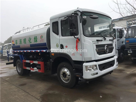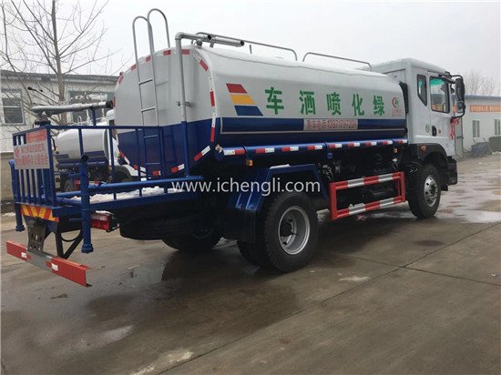 根據(jù)客戶要求:罐體容積約12立方;專用功能為:前沖后灑,帶側(cè)噴,帶高位花灑,罐體后帶工作平臺(tái),平臺(tái)上安裝綠化灑水高炮,灑水炮可全方位旋轉(zhuǎn),并有多種雨?duì)羁烧{(diào)節(jié)(大雨、中雨、毛毛雨、霧狀),泵可自吸自排,帶自流閥,帶消防接頭,帶過濾裝置。
