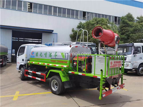 根據客戶要求:罐體容積約5立方。專用功能為:前沖后灑,帶側噴,罐體后帶工作平臺,平臺上安裝綠化灑水高炮,灑水炮可全方位旋轉,并有多種雨狀可調節(大雨、中雨、毛毛雨、霧狀),泵可自吸自排,帶自流閥,帶消防接頭,帶過濾裝置。根據客戶特殊要求后平臺加裝全自動柴油機霧炮噴霧機組,可做降塵實用,遙控操作。車輛交付客戶特別滿意!感謝信任!