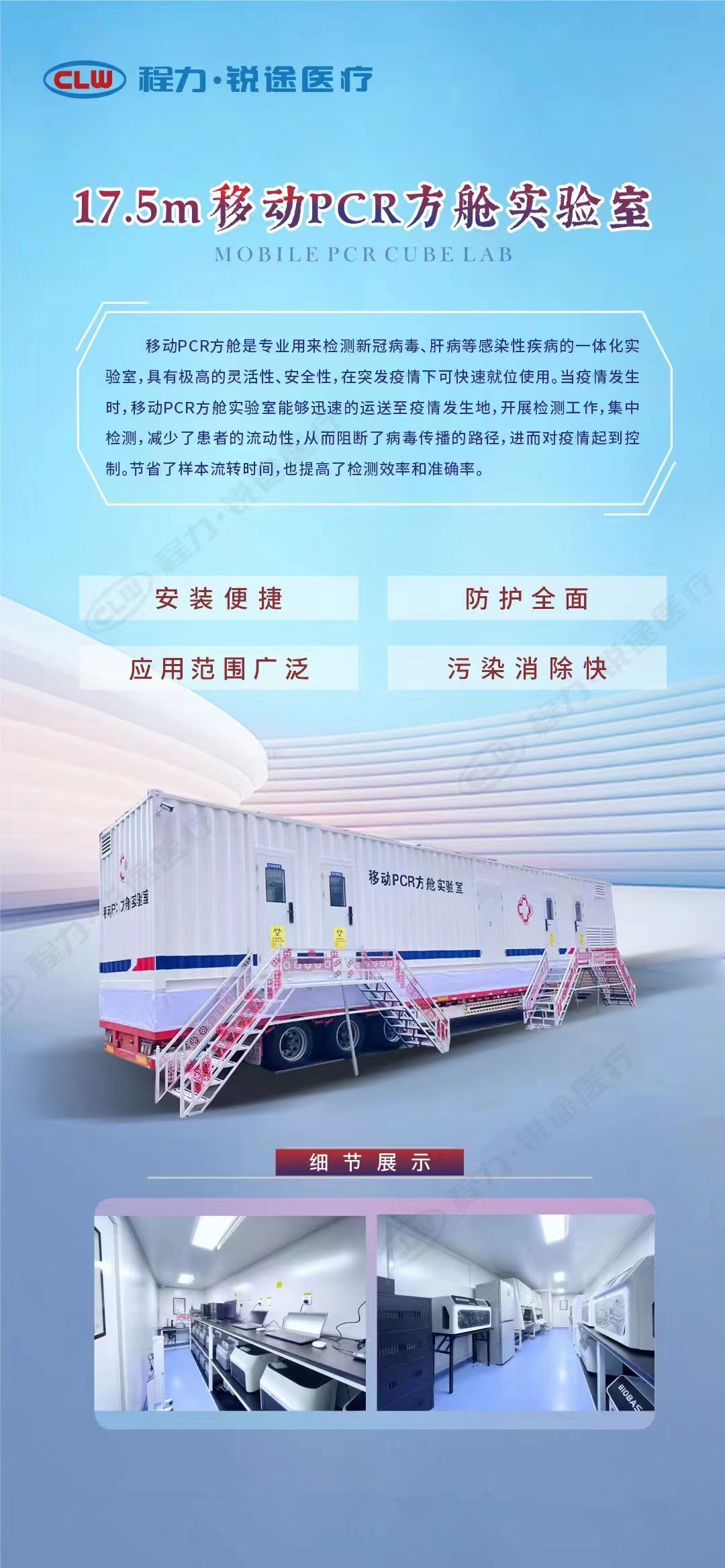移動PCR方艙是專業用來檢測新冠病毒、肝病等感染性疾病的一體化實驗室,具有極高的靈活性,安全性,在突發疫惜下可快速就位使用。當疫惜發生時,移動PCR方艙實驗室能夠迅速的運送至疫情發生地,開展檢測工作,集中檢測,減少了患者的流動性,從而阻斷了病毒傳播的路徑,進而對疫情起到控制。節省了樣本流轉時間,也提高了檢測效率和準確率。安裝便捷,防護全面,應用范圍廣泛,污染消除快。