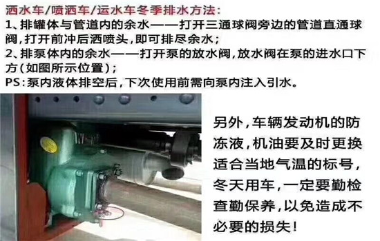 在寒冷的冬季里,應(yīng)將灑水車水泵和水管內(nèi)的水放空,以防凍裂。我國北方一般嚴(yán)冬不再施工,所以施工一結(jié)束,就立即將水泵水管內(nèi)的水排空,防患于未然。