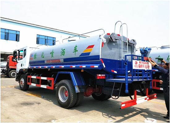上裝配置:罐體采用國標Q235碳鋼,罐體厚度4mm,前后封頭5MM加厚型,罐體實際容積12-15立方,產品質量成熟可靠,設計先進合理,比同類灑水泵壓力大、吸程遠、使用壽命長,可泵進泵出。前沖、后灑、側噴,消防栓接口,帶后工作平臺及綠化高炮(可全方位旋轉,可連續調成直沖狀、大雨、小雨、毛毛雨),水位計,兩根等長輸水管,其余標配。