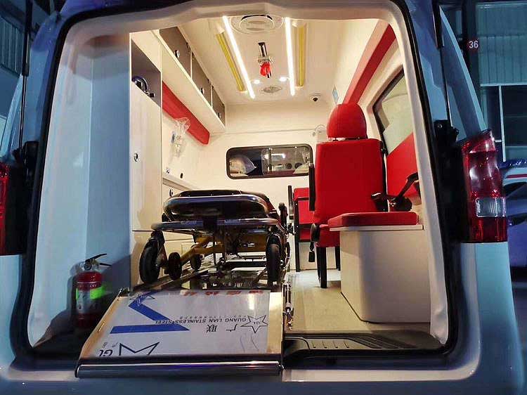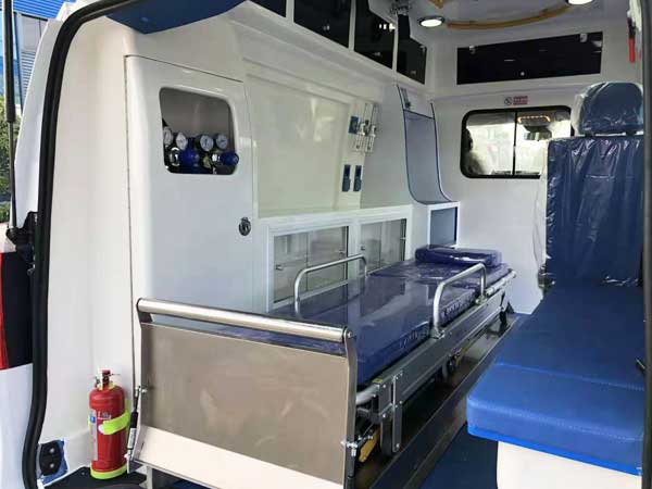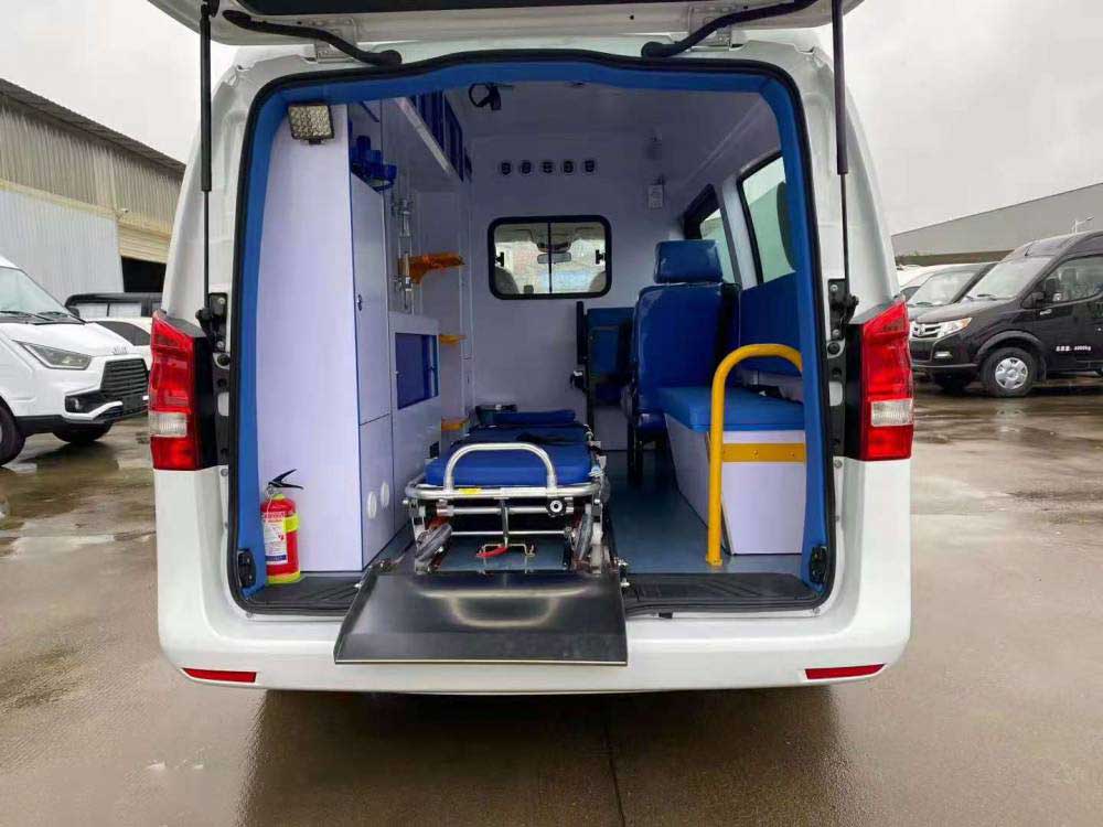 奔馳威霆監(jiān)護(hù)型救護(hù)車,車內(nèi)配備的有2千克的滅火器和支撐架。醫(yī)療艙中隔墻上方安裝長方形液晶記時器。醫(yī)療艙中門的位置安裝了自動感應(yīng)式伸縮踏板。醫(yī)用專用腳踏式污物桶。