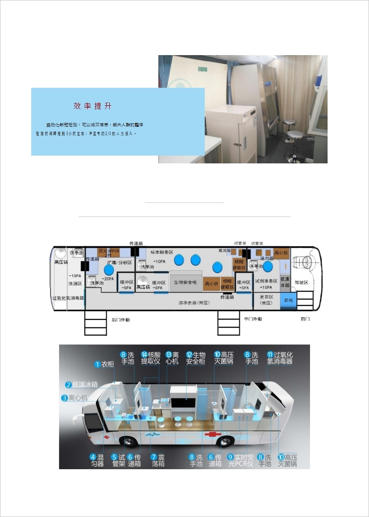 金旅12米體檢車醫(yī)療車,醫(yī)療室分區(qū): 試劑準(zhǔn)備區(qū):負(fù)責(zé)試劑準(zhǔn)備及配制RT PCR反應(yīng)液。車身電源設(shè)計(jì)分二路設(shè)計(jì),設(shè)置專用智能電控器,分別對(duì)DR機(jī)、照明和各功能檢查等系統(tǒng)單獨(dú)控制,并設(shè)漏電過載保護(hù)裝置。超大空間:實(shí)現(xiàn)最大級(jí)別中巴車的最長(zhǎng)縱向距離,客艙內(nèi)部高度達(dá)到1980mm。檢測(cè)平臺(tái)系統(tǒng)各柜體內(nèi)部應(yīng)根據(jù)需要設(shè)置儀器固定裝置。