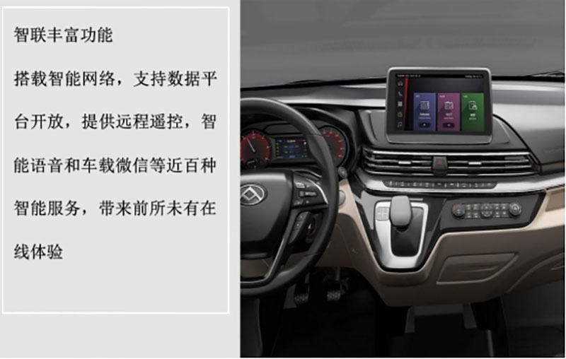 大通V90體檢車醫療車內飾配置:帶有大型懸掛式中央控制屏幕的分層中控臺。駕駛者可根據個人愛好采用Eco經濟和Sport運動兩種駕駛模式。額定載客(含駕駛員)5-7 人。中控臺干凈整潔很有效的利用空間。