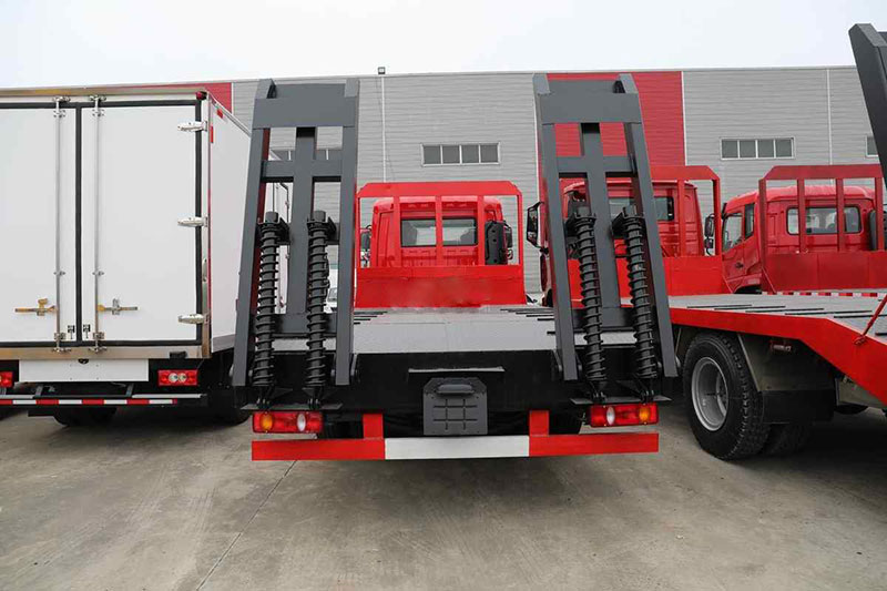 新款國6專底D3單橋平板運輸車實拍圖_改裝廠_有售,尾部安裝簡易爬梯,保證作業時不會發生翹頭事故。車身輪胎使用高彈性實心胎,可增加承載力和壽命,降少顛簸帶來的損失。前8后10+7的多片式鋼板彈簧懸架。爬梯選取加強型設計,選取三道筋雙簧加固處理,能夠采用液壓爬梯結構帶后支腿,平板帶有斜支撐,平板能夠伸縮。