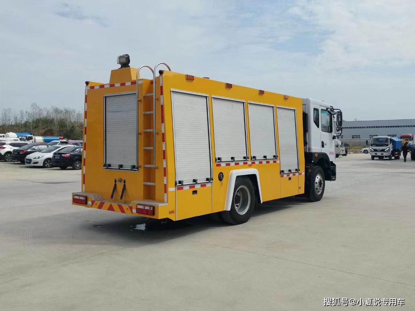 多利卡D9工程黃牌搶險救援車,本實用新型的有益效果:結構布置科學合理,綜合性、一體化程度高,非常實用。整體穩定性好,快速響應排水效率高、一體操作輕便實用、功能多樣組合便利、用途廣泛性價比高。整車底盤后部安裝2套電動支撐系統,保證車身行駛安全。可代步,可照明,可供電的功能,為夜間施工救險給予了便利。踏步選用花紋鋁板,防滑耐磨,采取壽命長。廂體使用特殊材質,整體重量輕,強度高,耐腐蝕性強。
