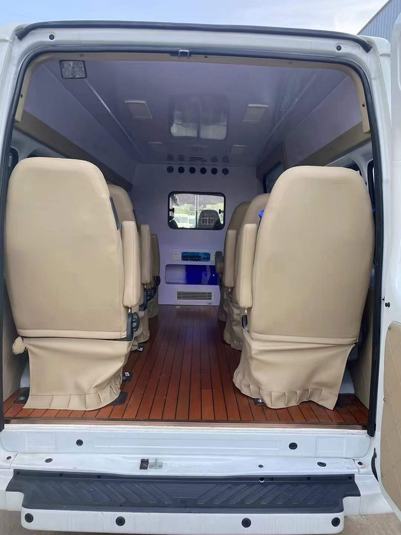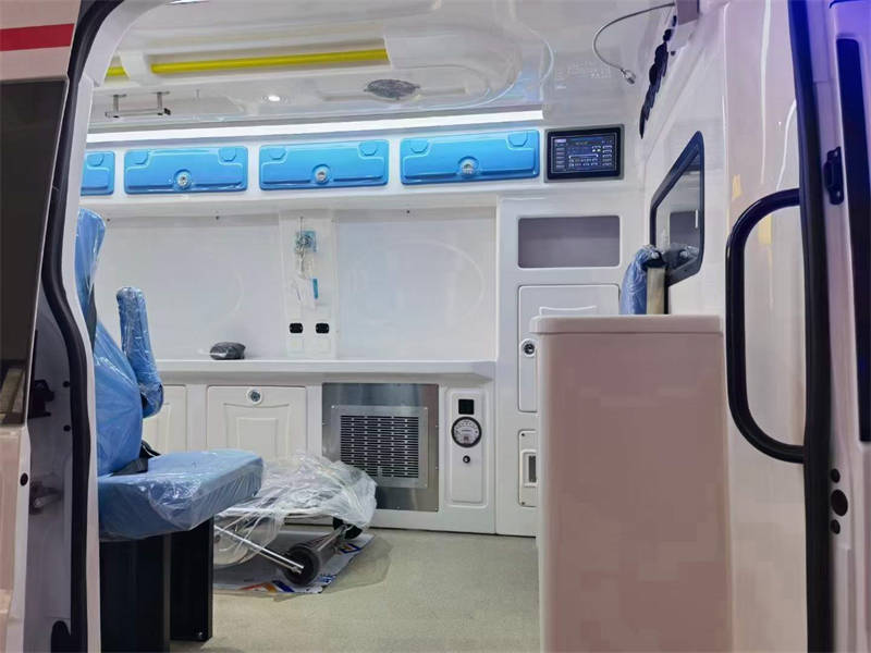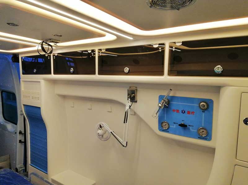 新時代全順V348短軸救護車,艙內配有定向排風系統。后門上車照明燈,夜間工作也很利于。鏟式擔架安裝在后門左內側(或在柜式床內存放)。醫療艙左側藥品、器械儲物柜。兩側白色照明燈。救護車整體都配備的有電路控制系統及保護。前部設置的有小醫療柜。