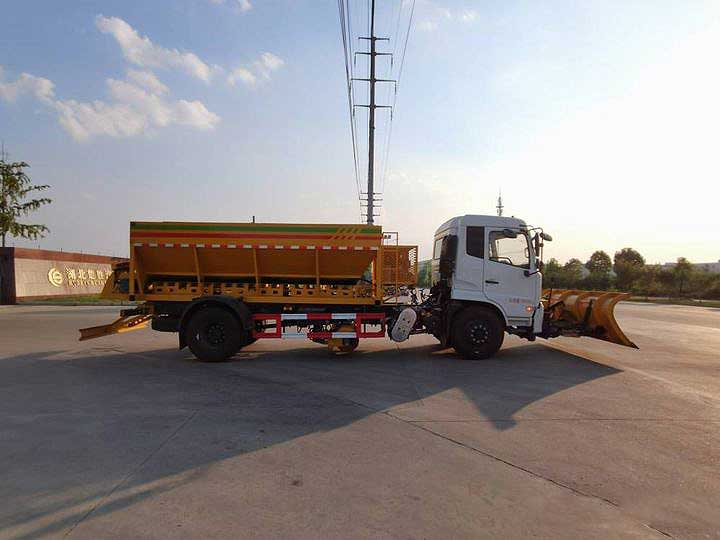 東風天錦12方除雪車,上裝廂體配備高質量的融雪撒布機。除雪鏟3-3.5米。除雪鏟結構合理,可將雪推向一側,并能起到拋雪功能,除雪鏟設防雪棚,具有防止雪飛濺到作業車擋風玻璃上,以免影響駕駛員視線。刷毛為圓盤式單片組合而成,選取聚丙烯與彈性鋼絲混合排列。車體之外配備照明系統,輕易夜間作業。