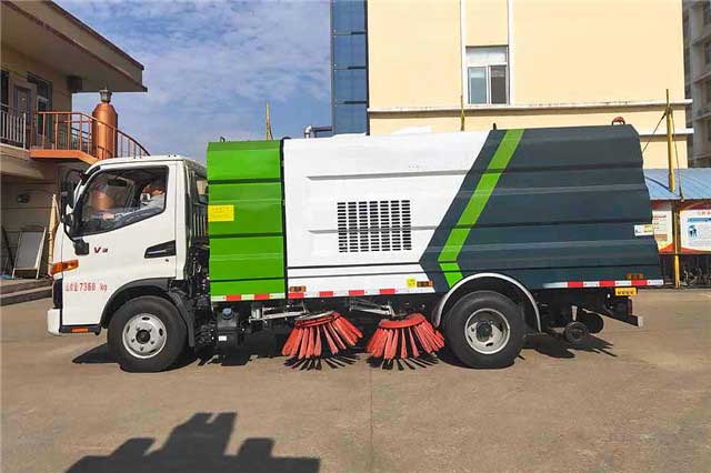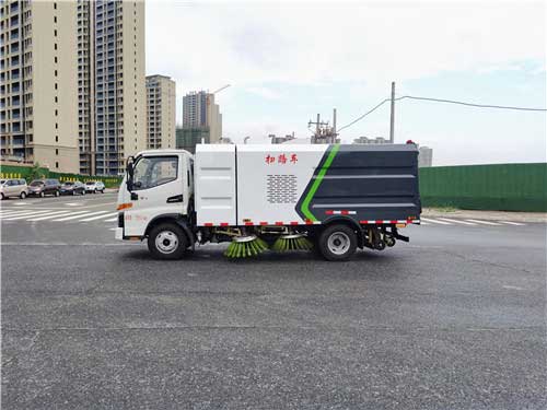 5.5方掃路車_江淮駿鈴V3掃路車,清水箱容積1.5立方,垃圾箱容積4立方,可持續工作4小時以上。垃圾箱選取雙層不銹鋼結構,結構穩定,耐一般腐蝕。長期選用不易變形。上裝箱體分為三大部分,垃圾箱,清水箱,副發動機艙。吸塵盤的四周設有高度可調節的吸嘴輪,這樣的吸嘴輪有三個。廂體方型結構,受力均勻。輔機艙內,設有輔機、油箱、離心風機、液壓閥組等部件,半封閉結構,維修容易。