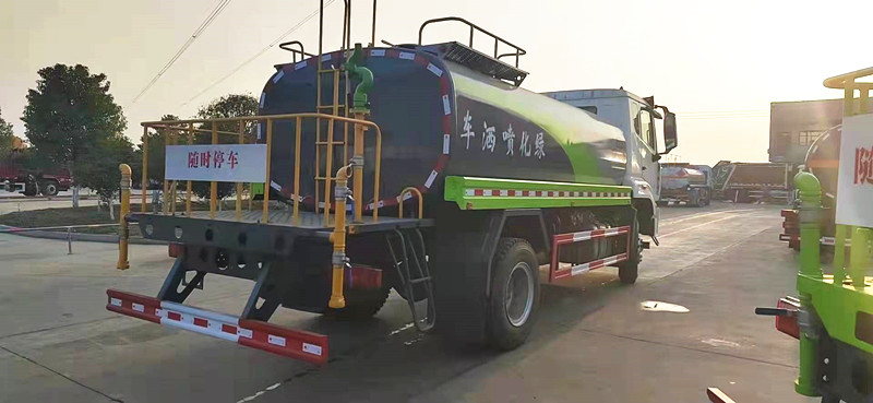 前沖(噴)、后灑、帶側噴(花灑)、帶后工作平臺、平臺上安裝綠化灑水高炮(炮噴射形狀可調節:直沖、大雨、中雨、毛毛雨、霧狀、可連續調節,360°旋轉),配消防接口,自流閥,濾網,帶自吸自排功能。
