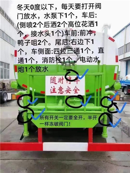 2、每次使用灑水車后,請(qǐng)打開車輛全部球閥開關(guān)放水(特別注意水泵底部小球閥不要忽略掉了),防止球閥水泵凍裂。以免造成不必要的損失。