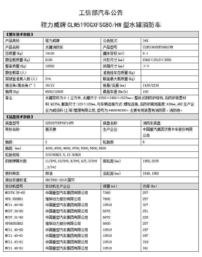 重汽豪沃8噸水罐消防車,整車型號:CLW5190GXFSG80/HW型水罐消防車,采用重汽豪沃ZZ5207TXFV471GF5原裝底盤改裝而成水罐消防車。中國重汽與德國曼合力打造的TX系列消防車專用底盤,標配引進的具有世界先進技術的MC07系列電控高壓共軌發動機,造型威猛,內部超大空間,駕乘舒適,精工打造而成的具有效率高、自重輕、動力強勁、輕快省油、機動性強、噴灑射程遠、戰斗力強等突出優勢的消防滅火車輛。整車由消防員乘員室和車身兩大部分組成,乘員室為改裝雙排,可乘坐2+4人,該車為內藏罐結構,車身前部為水罐+器材箱,后部為泵房。載液罐體為優質碳鋼,內部噴涂環氧底漆,與底盤采用彈性連接,載水8100kg,裝備了CB10/60型低壓消防泵,額定流量60L/S,車頂安裝成都威斯特生產的PS48型車用消防炮。該車最大的特點是機動靈活、操控性好、維修簡便。是城市滅火、廠礦企業、石油化工、森林港口及消防官兵滅火戰斗、搶險救援的消防裝備,撲救大型火災和一般物質火災。可選上牌種類(民用/軍用)手續。