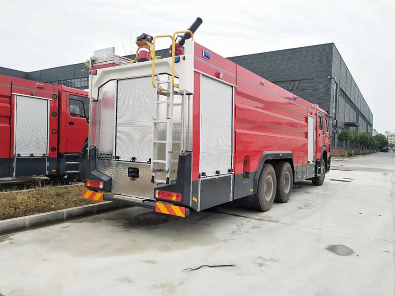 16噸泡沫消防車_重汽豪沃后雙橋泡沫消防車,器材箱內設置有儲物盒,可以放置一些小型工具。載液罐體應用的優質碳鋼材料,罐體內部應用特殊底漆噴刷,防止生銹、腐蝕。設有工具箱及卷簾門,可放置小型工具。主框架結構選取優質方管焊接,外裝飾板選取碳鋼板焊接。車內器材應用專用夾具固定,器材是由防腐蝕、防震動和防脫落的專用材料制成。