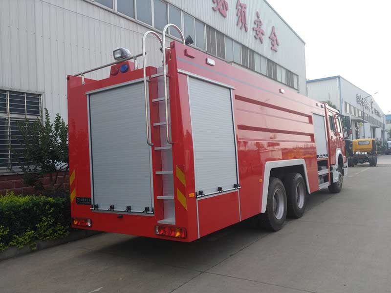 16方水罐消防車_重汽豪沃后雙橋水罐消防車,爬梯可以輔助消防員上到箱體頂部操作消防水炮,對準火災(zāi)點進行消防滅火。消防管路全部選用大口徑鋁合金材質(zhì),管路壓力損失小。機動靈活、操控性好、維修簡便。水泵的位置中置或后置,泵房和器材箱左右兩側(cè)安裝有新款易拉高強度鋁合金卷簾門。器材支架選擇歐洲技術(shù)生產(chǎn)的鋁合金型材,內(nèi)藏式塔接制造,全內(nèi)六角連接結(jié)構(gòu),造型漂亮,結(jié)實耐用。
