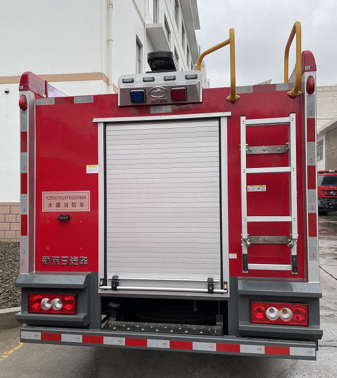福田康瑞H2_2.5方水罐消防車,車輛顏色為消防車通用消防紅,運用轎車油漆處理技術,增強油漆附著力、均勻性,耐用性;。消防系統使用電、氣動控制,操作簡捷,消防炮150m無線遙控。罐體形式為內藏式,材料選取優質碳鋼(Q235A),板材厚度3 mm。泵房和器材箱左右兩側安裝有開啟有利于便捷,強度高、外型新式的鋁合金卷簾門。