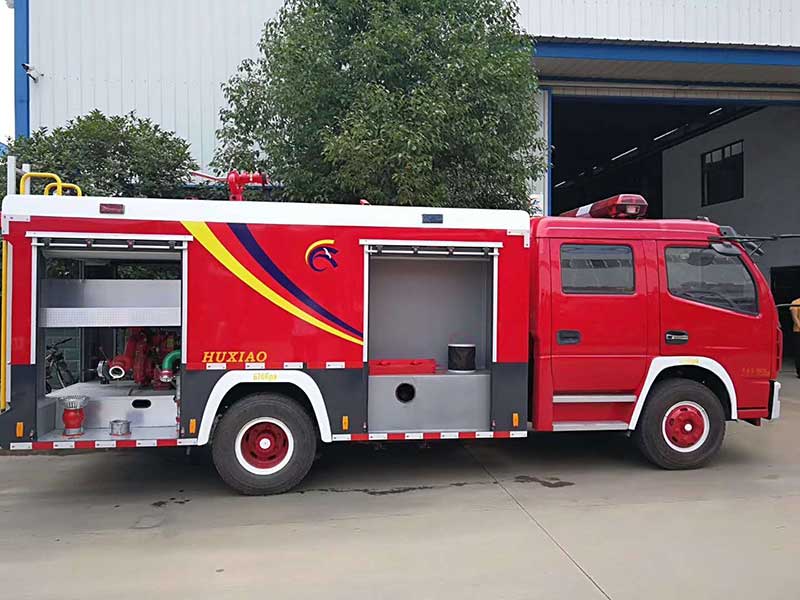 5方水罐消防車_東風多利卡D7雙排水罐消防車,車輛尾部安裝可折疊式爬梯。器材箱使用引進歐洲技術生產的鋁合金型材內藏式塔接技術制造,全卯接結構。全車兩側上方各配有2個紅藍爆閃燈及2個側照明燈。載液罐體為優質碳鋼,與底盤選取彈性連接。器材箱內設置有儲物盒,可以放置一些小型工具。駕乘室后部設置的器材箱安裝有鋁合金卷簾門,內設有照明,物品拿取利于。