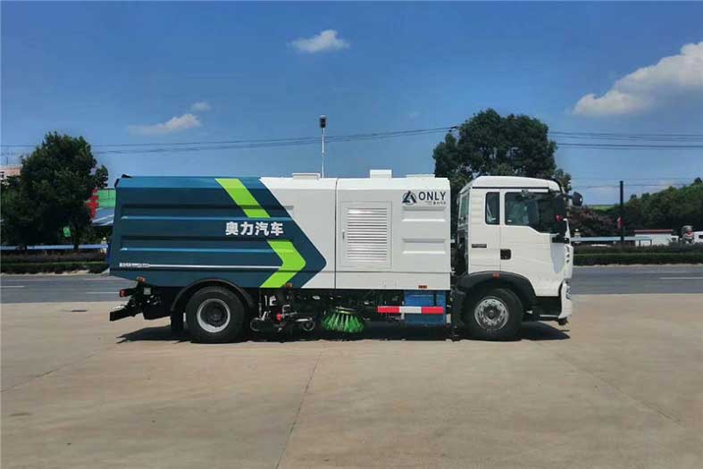16方洗掃車_重汽豪沃T5G洗掃車功能特點(diǎn):左、右高壓側(cè)噴桿與吸嘴“V”型布置,液壓操作收放,并可調(diào)整“V”形角度及高壓水噴嘴角度,水流沖擊力大,能高效匯集污水,并具噴桿有防撞和自動(dòng)復(fù)位功能。能夠隨垃圾箱體舉升的動(dòng)力倉罩可使動(dòng)力系統(tǒng)的維修保養(yǎng)極為便利。洗掃車作業(yè)時(shí)先用邊刷將道牙處的垃圾向中間集中,再用高壓水進(jìn)行清洗,然后由吸口將污水及垃圾吸到污水箱中。手持不銹鋼噴槍配快速接頭,能簡單地與沖洗卷盤連接或脫開。