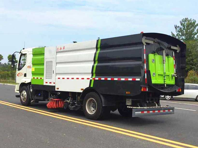 16方洗掃車_東風柳汽乘龍M3洗掃車,廂體堅固耐用。廂體選擇薄板焊接工藝。液壓油冷卻選用先進的強制風冷散熱系統。垃圾箱內配有防溢報警裝置和高壓噴霧清洗裝置。卸料門開啟速度45度。