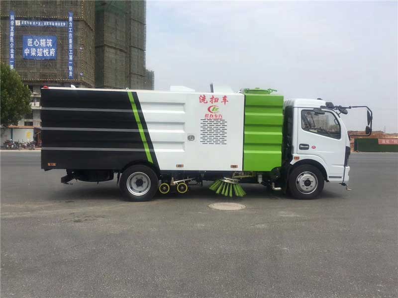 東風(fēng)多利卡D7_9方洗掃車,集掃路車和高壓清洗車功能于一體,實(shí)現(xiàn)在一次作業(yè)中完成清掃、高壓清洗和垃圾、污水的收集。駕駛室后下方裝有低壓前沖,沖洗寬度可達(dá)24m,可像灑水車一樣對路面進(jìn)行大面積沖洗。選取刷洗和高壓清洗的掃洗結(jié)合、垃圾收集、污水回收、液壓傾翻卸料的作業(yè)方式對路面進(jìn)行刷洗作業(yè)。后輪前設(shè)有強(qiáng)磁力吸附總成(磁力吸附器),能有效吸附鐵釘?shù)燃怃J黑色金屬物,防止作業(yè)過程中扎輪胎。不僅能夠在室內(nèi)運(yùn)行,而且能夠在室外運(yùn)行,操作有利于便于。具有舉升功能的垃圾箱內(nèi)裝配有高壓沖洗噴頭,使得卸料更為利于、干凈徹底。車尾裝有后噴霧桿,可進(jìn)行路面噴霧保濕降塵。