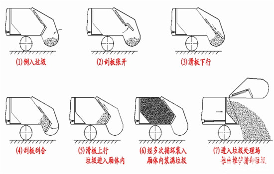 壓縮式垃圾車裝滿垃圾后垃圾箱完全處于封閉狀態,在轉運途中不會污染環境。垃圾車在處理(或填埋)場卸出垃圾時,先舉起填裝器,敞開垃圾箱后端,原停于垃圾箱前端的推鏟向后移動,沿水平方向,把垃圾箱里的垃圾推出。垃圾卸料見圖一中步驟。