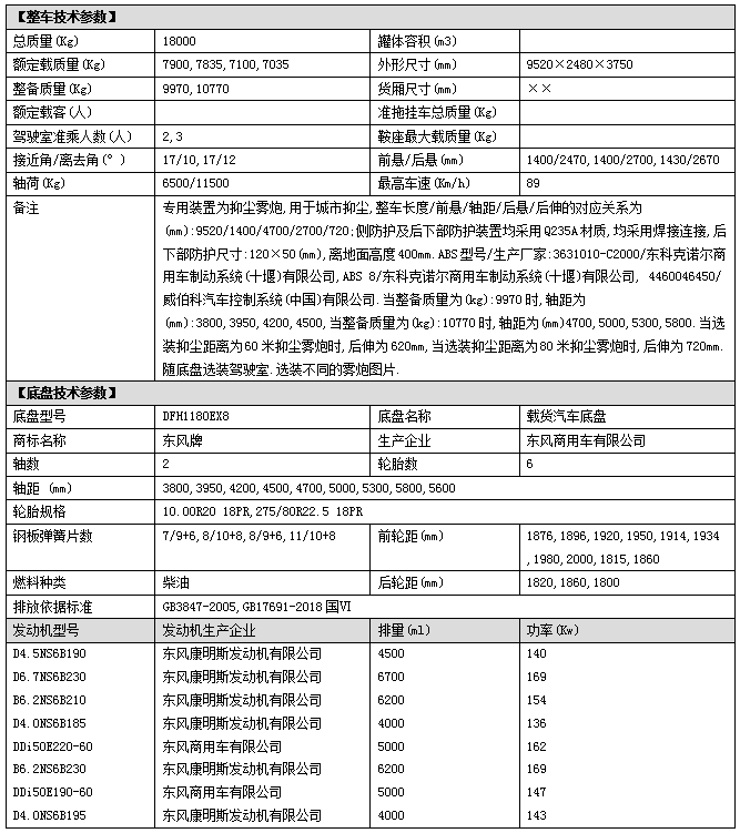底盤配置:東風天錦系列新款駕駛室,4700mm軸距,康明斯230馬力(B6.2NS6B230)發(fā)動機,國六排放,陜齒8檔變速箱,10.00R20鋼絲胎,原裝空調(diào),電動窗,ABS,斷氣剎,方向助力;