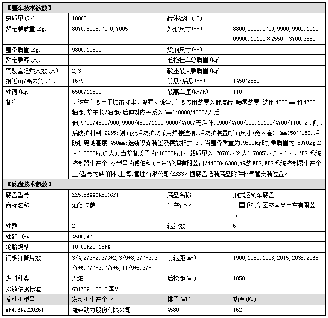 上裝配置:罐體容積:12立方,方形罐體,罐體鋼板采用Q235碳鋼鋼材制作,鋼板厚度5mm,配大功率專用灑水車泵,帶前沖、后灑、側(cè)噴功能,尾部帶工作平臺,平臺上安裝綠化高炮和風(fēng)筒式霧炮機(jī)(霧炮可用于農(nóng)藥噴灑、多功能抑塵等功能),帶柴油副發(fā)電機(jī)組,操控方式:手動/無線遙控器(遙控距離100米),帶消防接口,自流閥、可自吸自排,該車輛結(jié)構(gòu)緊湊,布局合理,部件做工精細(xì),產(chǎn)品配置完善,操作性能好。后平臺可選裝50-60米、60-70米、80米、100米、120米霧炮機(jī)組;其他標(biāo)配。